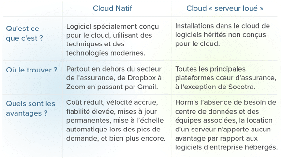 La plupart des plateformes d’assurance n’ont jamais été conçues pour le cloud. Elles ont été conçues pour fonctionner à partir des centres de données des assureurs. Les fournisseurs de services cloud tels qu’Amazon Web Services (AWS), Azure et Google Cloud louent des serveurs virtuels sur lesquels n’importe quel logiciel peut être installé, y compris les anciens logiciels d’assurance. De nombreux fournisseurs traditionnels font exactement cela et appellent cela le « cloud », mais il s’agit en réalité d’une technologie traditionnelle sur un serveur loué.