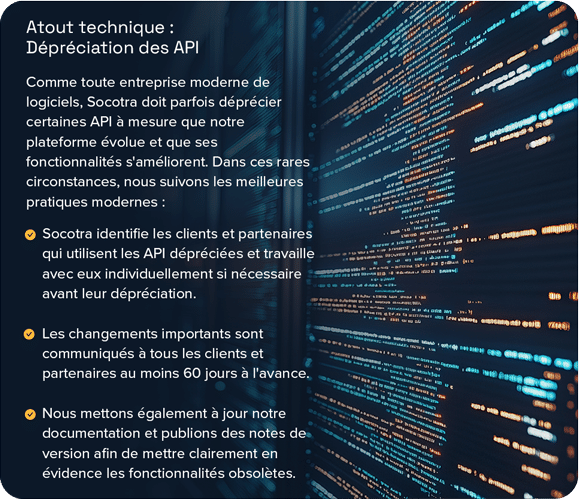 Socotra prône la philosophie des petites mises à jour hebdomadaires, sans impact sur les déploiements des clients ni sur leur disponibilité. Pour ce faire, une seule version du système est utilisée pour tous les clients, avec une bibliothèque publique d’API rétrocompatibles.