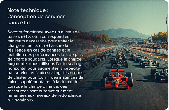 Les plateformes cloud matures telles que Socotra prennent en charge l’autoscaling, c’est-à-dire le démarrage et l’arrêt automatiques des serveurs en fonction de la demande en temps réel. Cette fonctionnalité permet à Socotra de répondre aux pics de demande sans sacrifier la vitesse ou la fiabilité, puis de réduire la capacité afin d’éviter tout gaspillage de ressources, le tout automatiquement et sans interruption du système.
