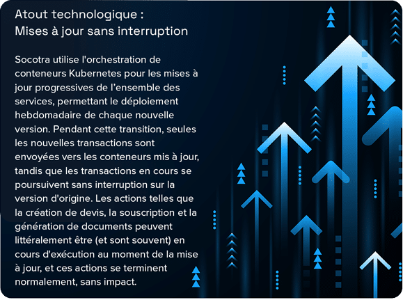 En 2023 et 2024, les clients de Socotra ont effectué 100 mises à niveau tout en subissant moins de 60 minutes d’indisponibilité totale. Cette fiabilité à la pointe du secteur est rendue possible grâce à la conception cloud native hautement résiliente de Socotra, unique parmi les fournisseurs de systèmes centraux d’assurance.